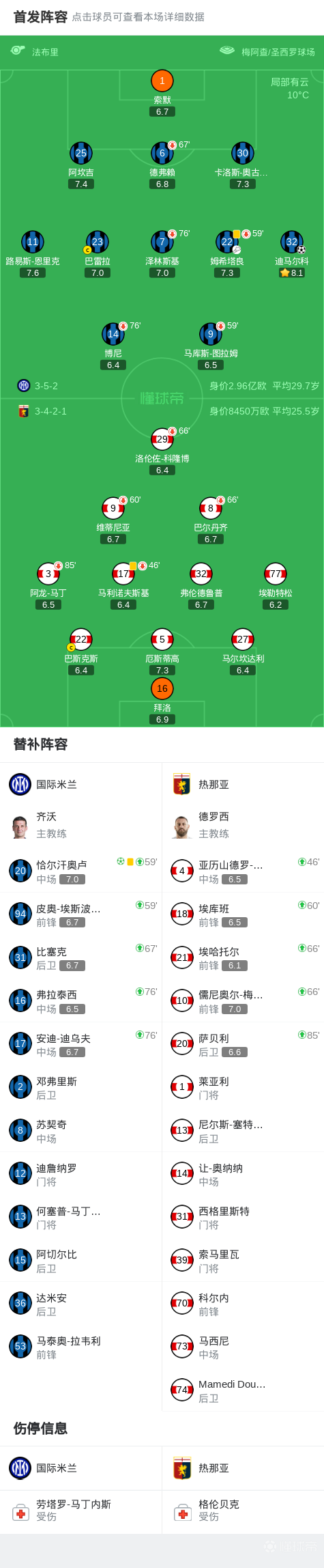 北京時間3月1日意大利足球頂級聯(lián)賽第27輪,國際米蘭主場對陣熱那亞。上半場,姆希塔良助攻,迪馬爾科凌空破門。下半場,路易斯-恩里克造點(diǎn),恰爾汗奧盧主罰命中。全場比賽結(jié)束,國米2-0戰(zhàn)勝熱那亞。